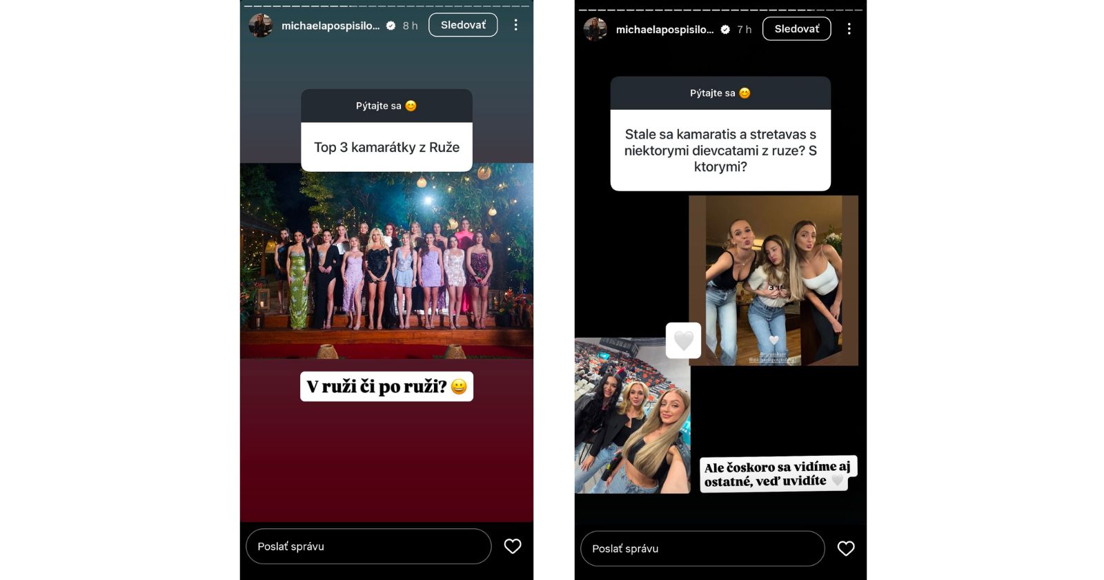 K záberu s dievčatami tiež Miška napísala, že sa čoskoro uvidí aj s ďalšími ružičkami a práve tieto zábery by mohli prezradiť, ktoré dievčatá ostali kamarátkami aj po šou, respektíve či vznikli nejaké nečakané priateľstvá, ktoré by diváci ani netipovali.
