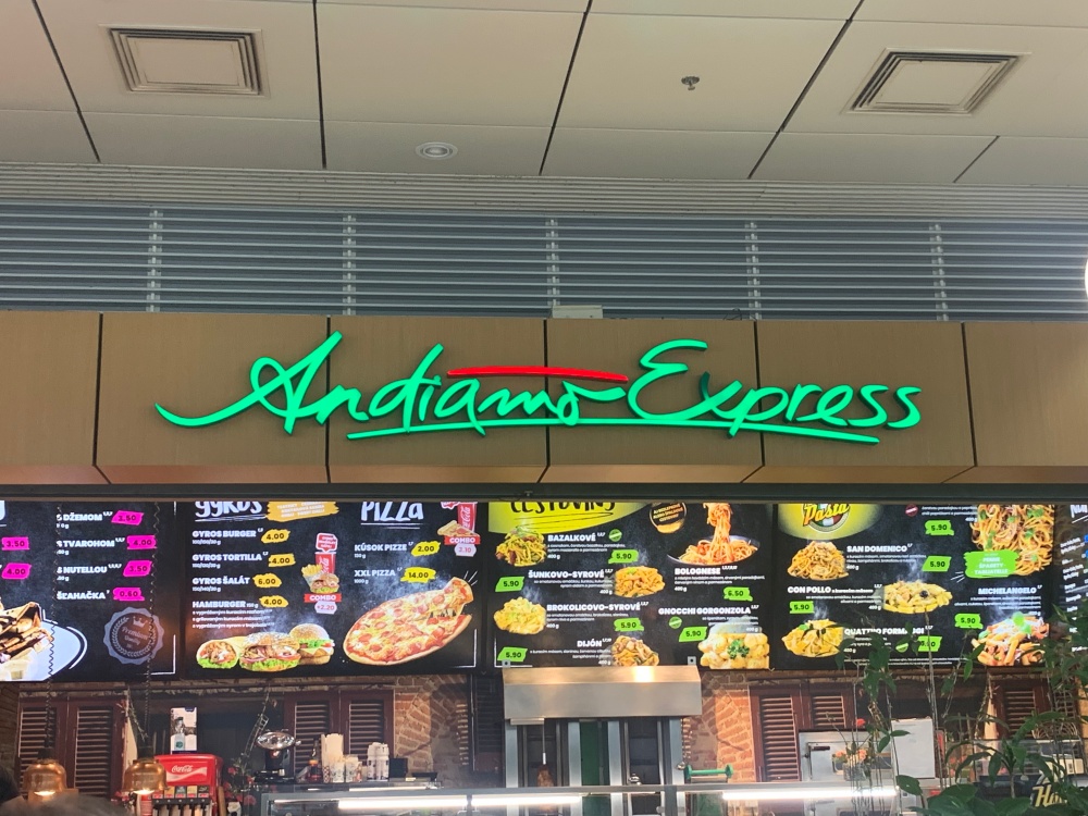 Hodinky ukazujú pár minút po 17:00, pri výdajnom pulte Andiamo Express sa nachádzajú ďalší traja zákazníci, ktorých objednávka prebiehala podobne komplikovane, ako tá naša. Prichádzame na rad, pričom nás ráznym hlasom oslovuje pani servírka s otázkou, čo si dáme.