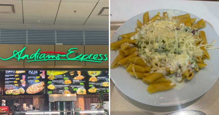 Objednávku teda meníme na penne so syrovo-brokolicovou omáčkou. Pri tomto type obsluhy a servírovania sa očakáva, že jedlo v nádobách je konštantne prihrievané, aby bolo zákazníkovi podané čo najrýchlejšie. V prípade Andiamo Express ide však o veľký omyl. Penne sú už na pohľad staršie a pravdepodobne nie čerstvé. Servírka ich naberá na tanier a odchádza do kuchyne, kde ich podľa chuti a výzoru šupla na chvíľu do mikrovlnky. Pridáva omáčku, strúhaný syr a podáva nám tanier. Cena za toto jedlo činí 5,9 eura.