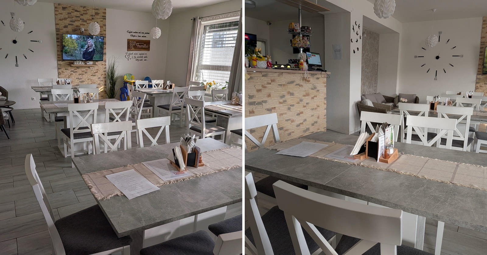 Hneď prvá budova, ktorú sme po príchode do dedinky so severnej strany zbadali, bola práve Pizzeria Família. Vyžarovala pekným a moderným dojmom, priam lákala hladných návštevníkov. Ľudia v okolí si navyše nemajú veľmi z čoho vyberať a sú určite radi, že sa v ich obci nachádza takýto podnik.