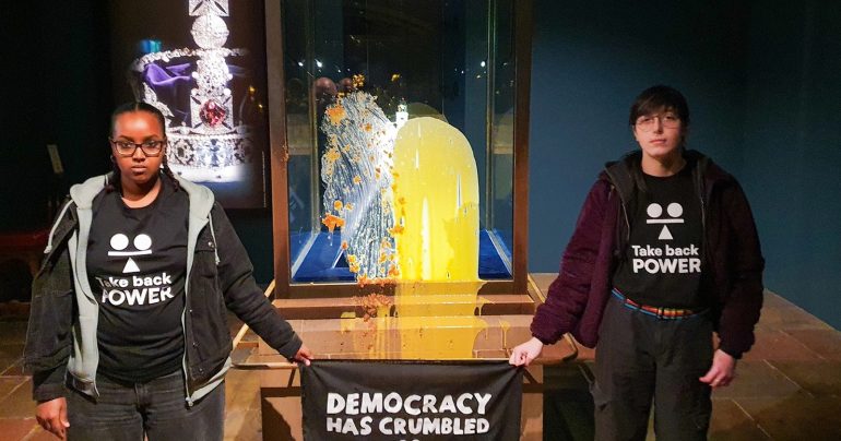 Organizácia Take Back Power objasnila, že touto formou protestu chcela upozorniť na svoje požiadavky. Skupina požaduje, aby bolo zriadené stále zhromaždenie občanov – „Snemovňa ľudu“ – s právomocou „zdaniť extrémne bohatých a napraviť Britániu“. Korunu nosí kráľ Karol III. pri niektorých oficiálnych príležitostiach, napríklad pri otvorení parlamentu. Mal ju nasadenú aj pri návrate do Buckinghamského paláca po korunovácii vo Westminsterskom opátstve v roku 2023.