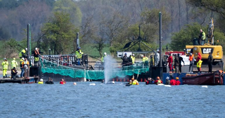 Záchranári v utorok ráno pripevnili k telu veľryby popruhy a pomocou nich ju ťahali kanálom, ktorý bol špeciálne vyhĺbený v piesku, aby sa mohla dostať k plavidlu pri ostrove Poel.