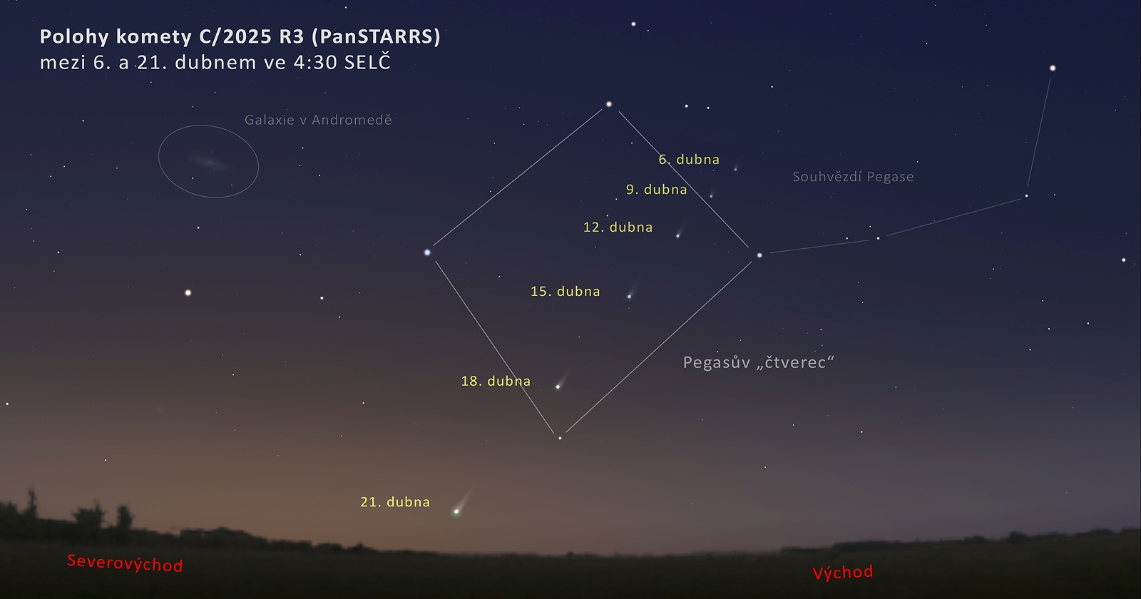 Na sledovanie kométy majú pozorovatelia len obmedzené obdobie. Viditeľná bude približne do 21. apríla a najlepšie podmienky nastávajú v ranných hodinách. Ideálne je vyraziť von okolo 4:30, keď sa kométa nachádza nízko nad východoseverovýchodným obzorom v súhvezdí Pegas. S každým ďalším dňom bude síce jasnejšia, no zároveň bude klesať nižšie k obzoru a jej pozorovanie bude náročnejšie. Skúsenejší pozorovatelia by ju mohli po 10. apríli zazrieť aj voľným okom, no odporúča sa použiť aspoň binokulár. Ten pomôže lepšie rozlíšiť jej jadro aj jemný chvost.