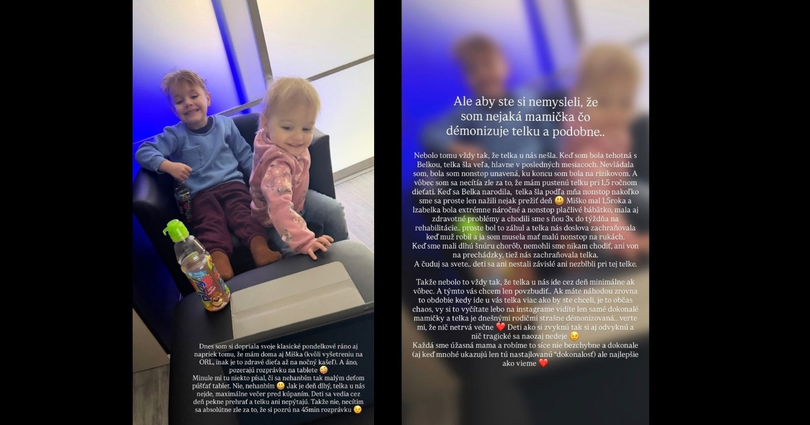 Dominika priznala, že ich domácnosť nebola vždy ukážkovo „bezobrazovková“. Vrátila sa najmä k obdobiu tehotenstva a prvým mesiacom po narodení dcéry, keď to pre ňu bolo fyzicky aj psychicky veľmi náročné. „Aby ste si nemysleli, že som nejaká mamička, čo démonizuje telku… nebolo tomu vždy tak, že telka u nás nešla,“ napísala úprimne.
