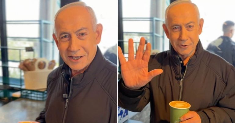 Vo videu si usmievajúci sa premiér objednáva kávu pri pulte cukrárne neďaleko Jeruzalema, keď mu muž za kamerou povie: „Na sociálnych sieťach hovoria, že ste mŕtvy“. Netanjahu s pohárom v ruke, použijúc hebrejskú frázu vyjadrujúcu silnú náklonnosť alebo túžbu po niečom, odpovedá: „Zomrel by som za kávu, rovnako ako by som zomrel za svoj ľud“.