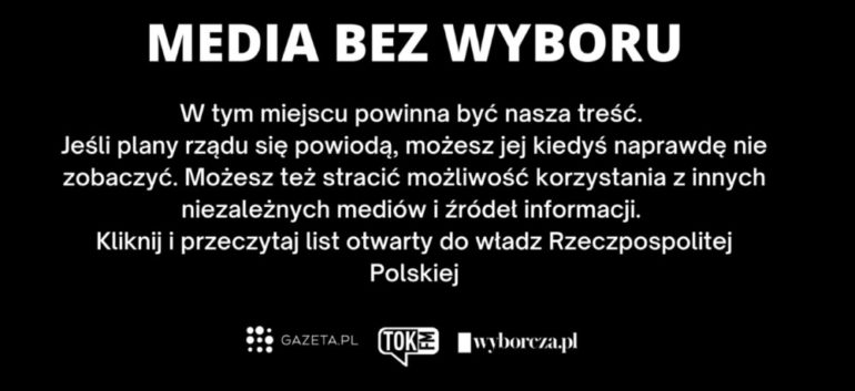 Na titulných stránkach desiatok celoštátnych novín vrátane najčítanejších denníkov Fakt a Gazeta Wyborcza bola biela správa na čiernom pozadí s textom „Média bez možnosti výberu“. Začiernené boli aj ich webové stránky.