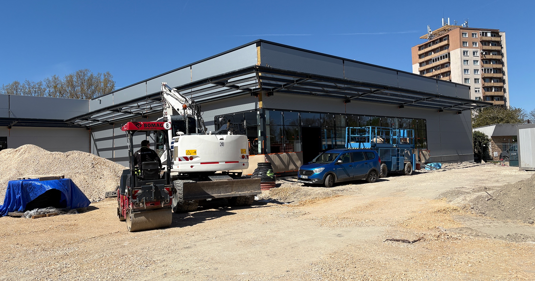 Na stavbe "OC Sedmičky" je rušno. Práce prebiehajú na dokončení interiérov, ako aj na realizácii parkoviska a okolitých komunikácií. Foto: Primum