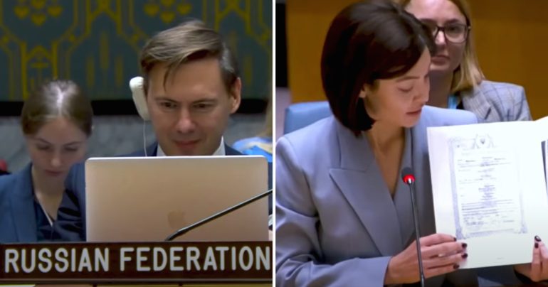 Kým Zarivnová rozprávala o vraždení, sexuálnom zneužívaní, nezákonných adopciách a militarizovaní ukrajinských detí Rusmi, ruský diplomat sa usmieval.