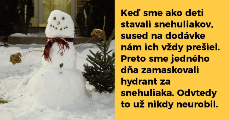 Mal som osem rokov, keď som si s kamarátmi staval malých snehuliakov. Postavili sme ich pekne do radu, boli sme zvedaví, akú dlhú reťaz z nich dokážeme urobiť. Samozrejme sa našiel blbec na dodávke, ktorý nám ich zbúral. Prišlo mu to asi veľmi zábavné, zničiť nám robotu. Nevzdávali sme sa. Stavali sme ich znova a znova. Zakaždým nám ich zbúral. Tak sme sa nahnevali. Hydrant sme zamaskovali za snehuliaka a ten kretén doňho nabúral.