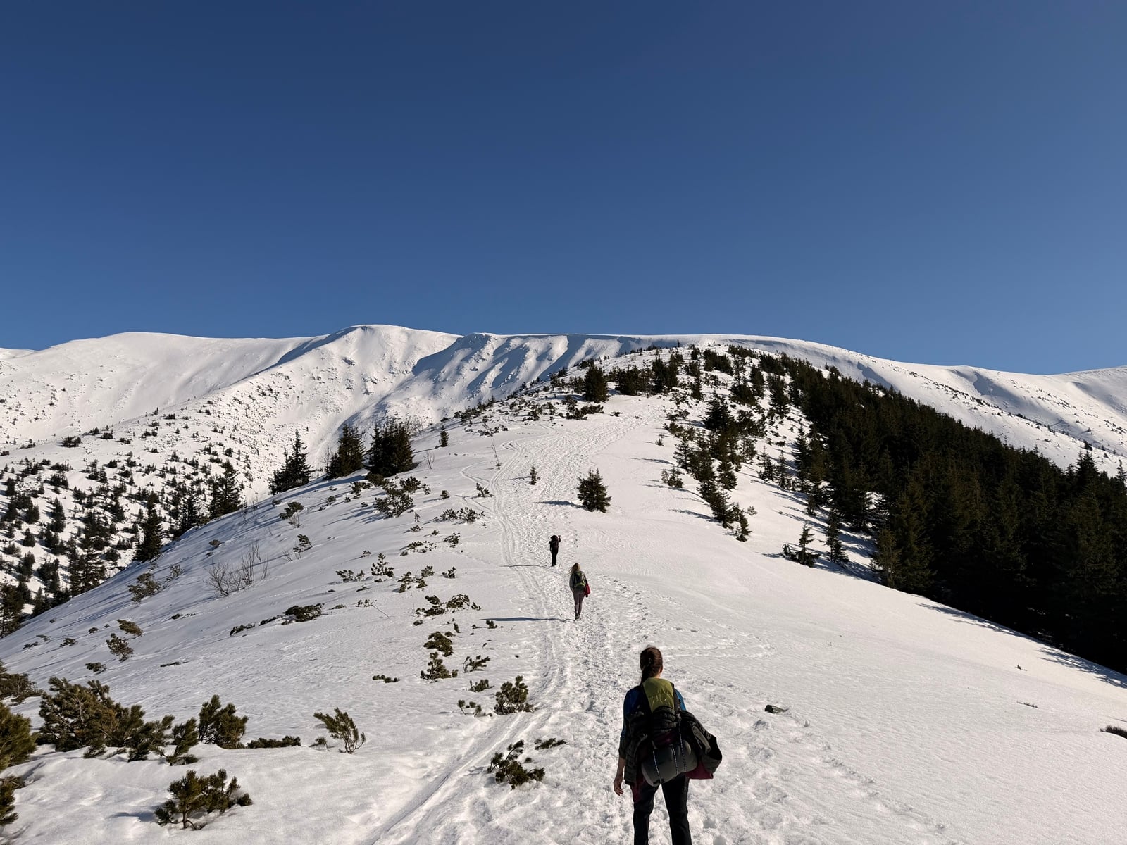 Vybrali sme sa po zelenej značke a prvá časť turistického chodníka viedla lesíkom so serpentínami. Keďže rána boli ešte chladné, v niektorých úsekoch bol chodník posiaty ľadom, preto sme si na turistickú obuv navliekli mačky a hneď sa nám kráčalo lepšie.