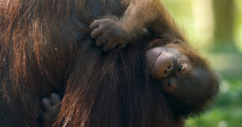 Orangutany zvyčajne rodia jedno mláďa, prípadne dvojčatá, a to najviac raz za šesť rokov, pričom interval medzi mláďatami môže byť až desať rokov. Medzinárodná únia na ochranu prírody (IUCN) klasifikuje orangutany z Bornea – známe svojou tmavohnedou srsťou a miernou povahou – ako „kriticky ohrozené“ kvôli rýchlej strate biotopov a nelegálnemu obchodu s divokými zvieratami. Tento druh žije vo voľnej prírode iba na indonézskom ostrove Sumatra a na ostrove Borneo, ktorý je rozdelený medzi Indonéziu, Malajziu a Brunej.