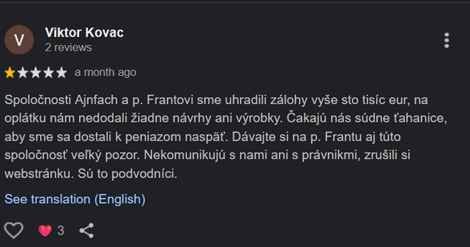 „Po zaplatení zálohy a zameraní bytu (leto 2025) sa náš projekt už nepohol. Nasledovali výhovorky (kolegovia, dodávatelia…), až prestal p. Franta komunikovať úplne (neodpisuje na maily, nedvíha telefón, napriek sľubom nevolá naspäť). Showroom vraj končí a nie sme jediní, kto sa ozval so sťažnosťou. Dávajte si na firmu a p. Frantu pozor,“ uvádza sa v jednej recenzii zákazníkov.