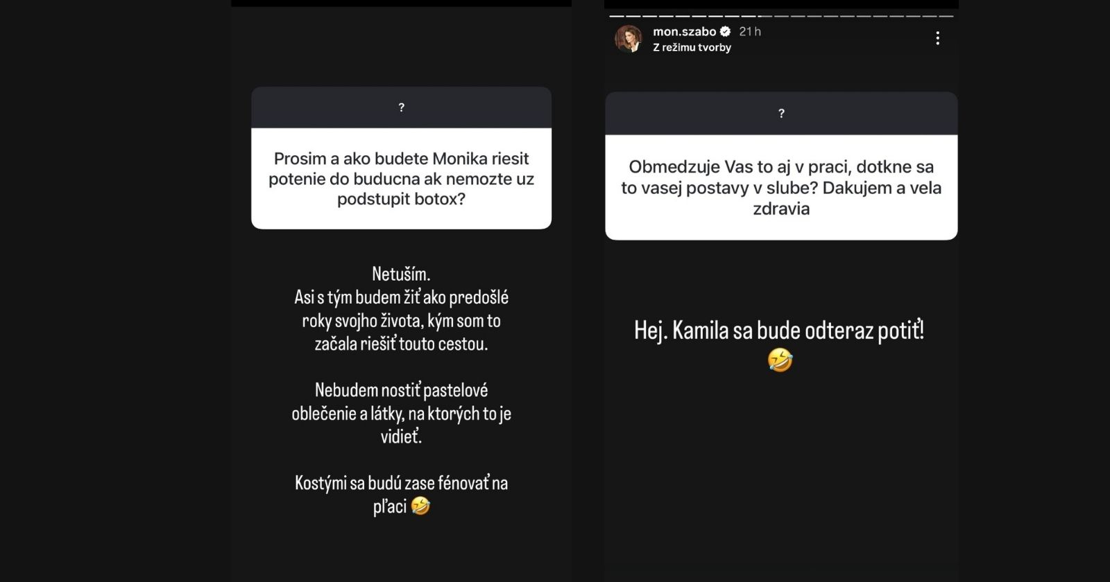 Jeden z fanúšikov sa preto opýtal priamo, či ju to nebude obmedzovať aj pri práci a či sa to môže nejako premietnuť do jej postavy v seriáli. „Hej. Kamila sa bude odteraz potiť!“ odpovedala Szabó stručne, no zato s humorom. Ako to teda napokon ovplyvní natáčanie a jej seriálovú postavu, ukáže až čas.